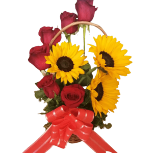 Canasta de 12 Rosas, 12 Girasoles y Bombones
