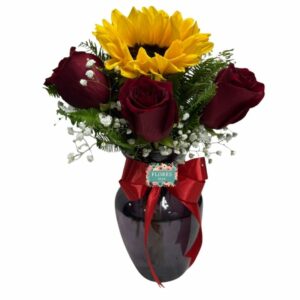 Florero de 4 Rosas Rojas y 1 Girasol con ilusión