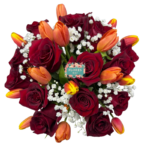 Base de 3 Rosas, 2 Lilium y 6 Bombones