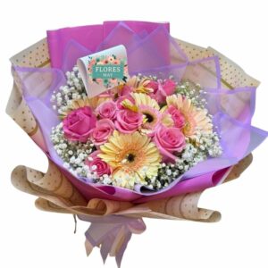Base de Flores Eternas Amarillas, Peluche Perrito 20cm, Bombones y Globito