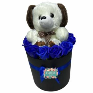 Bouquet de Girasoles y Rosas Eternas con Peluche Perrito 20cm
