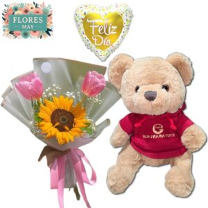 Bouquet de 2 Tulipanes, 1 Girasol, Peluche con Polerón de 30cm y Globo