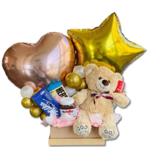Box con Oso 20cm, Bombones, Espumante y Globo Burbuja