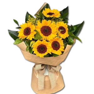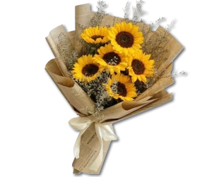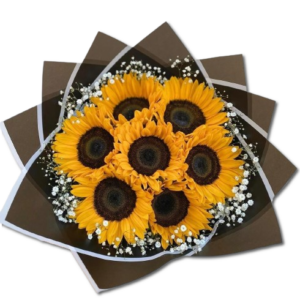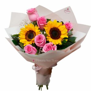 Base de 5 Rosas Rosadas, 1 Girasol y 3 Bombones