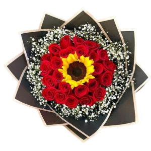 Canasta de 12 Rosas, 12 Girasoles y Bombones