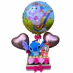 Base con Rosas Eternas, Bombones, Peluche Stitch y Globos