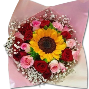 Bouquet de 3 Girasoles y 6 Rosas Rosadas