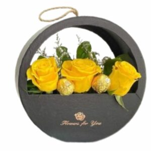 Arreglo Metálico de 3 Rosas Amarillas y 2 Bombones