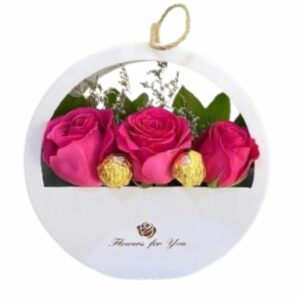 Arreglo Metálico de 3 Rosas Fucsias y 2 Bombones