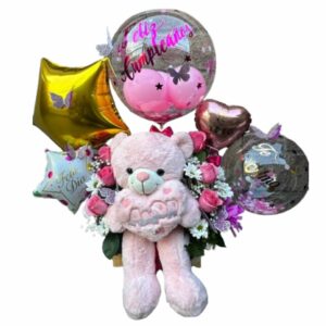 Base con Peluche 20cm, Bombones Belgian y Globos. Diseño sujeto a disponibilidad