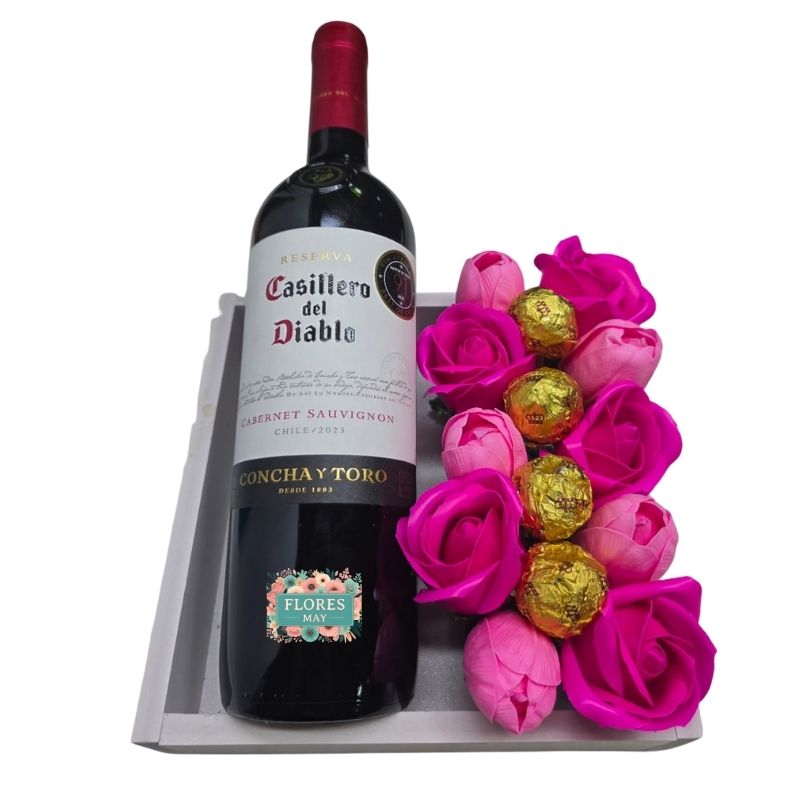 Base con Vino, Bombones, Tulipanes y Rosas Eternas Fucsias