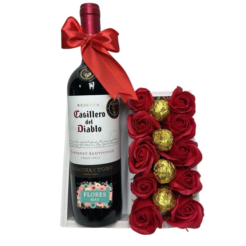 Base con Vino, Bombones y Rosas Eternas Rojas