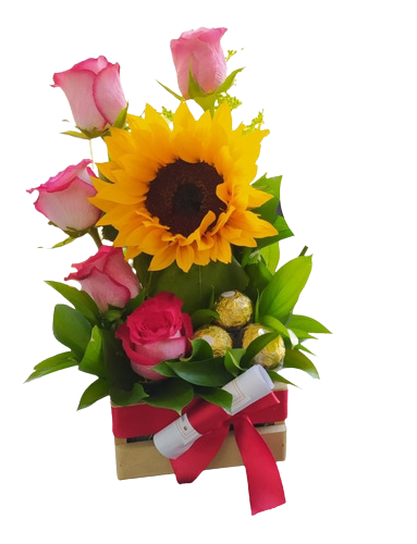 Base de 5 Rosas, 1 Girasol y 3 Bombones. Diseño sujeto a disponibilidad