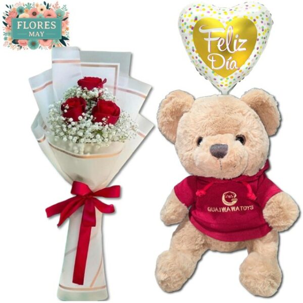 Bouquet de 3 Rosas, Peluche con Polerón y Globo