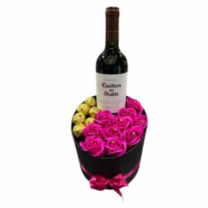 Box Cilindro de 9 Rosas Fucsias Eternas, 6 Bombones y Botella de Vino