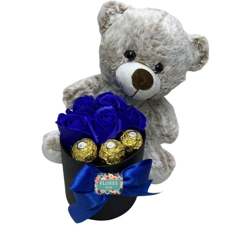 Box Cilindro Rosas Eternas Azules, Bombones y Oso 28cm