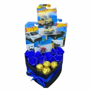 Box Corazón de 8 Rosas Eternas Azules, 4 Bombones y 4 Carritos y Globo Hot Wheels
