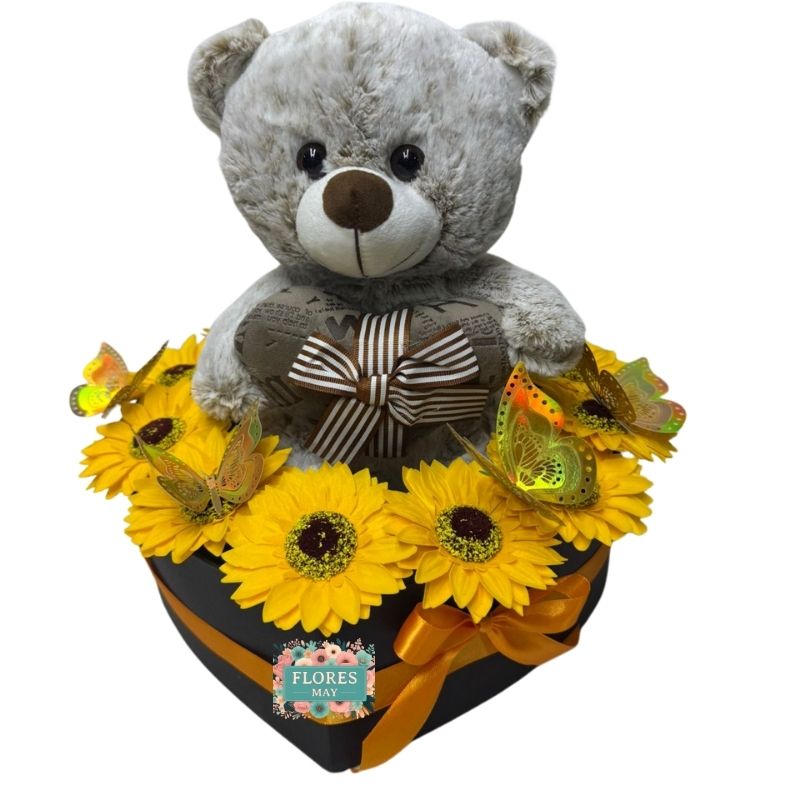 Box Corazón de Girasoles Eternos y Oso Peluche 28cm