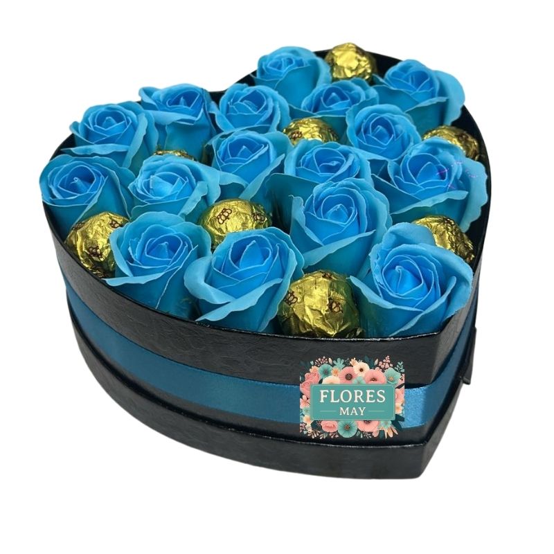 Box Corazón de Rosas 16 Eternas Celeste y 8 Bombones Valente