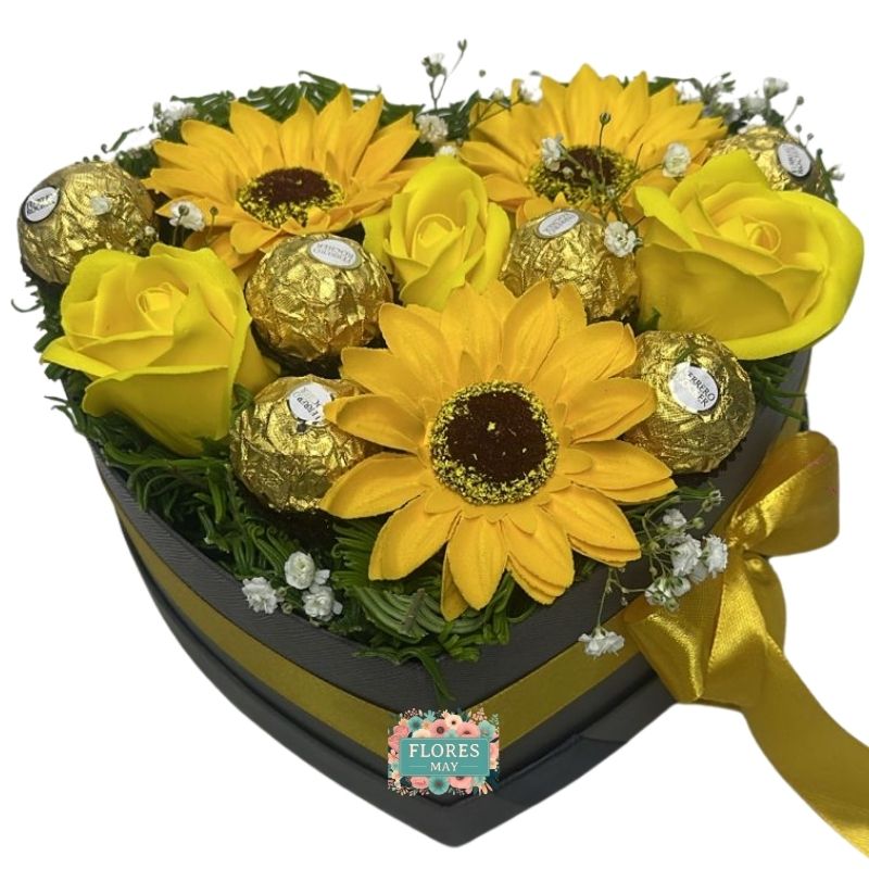 Box Corazón de Rosas y Girasoles Eternos con 6 Bombones Ferrero Rocher