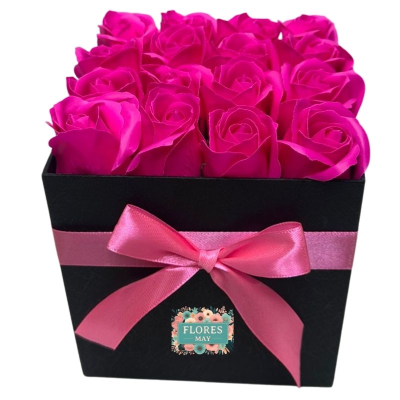 Box Cuadrado de 16 Rosas Fucsia Eternas