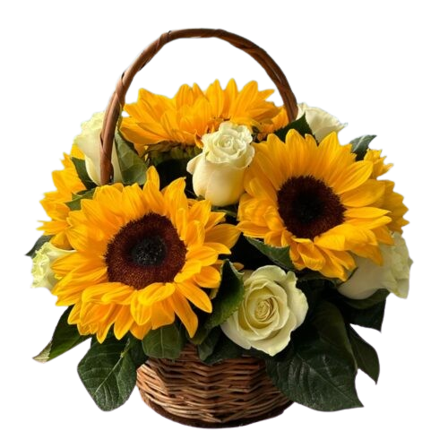 Cestita de Rosas Blancas y Girasoles