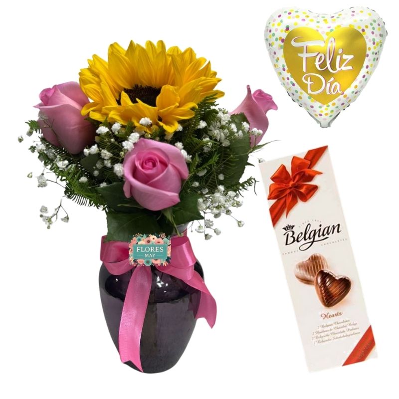 Florero de 4 Rosas Rosadas 1 Girasol, Bombones Belgian y Globo