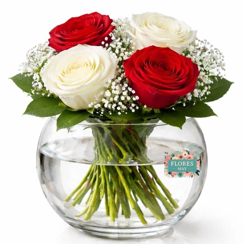 Pecera de 4 Rosas Rojas y Blancas