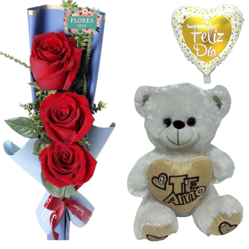 Ramo de 3 Rosas, Peluche Oso 30cm y Globo