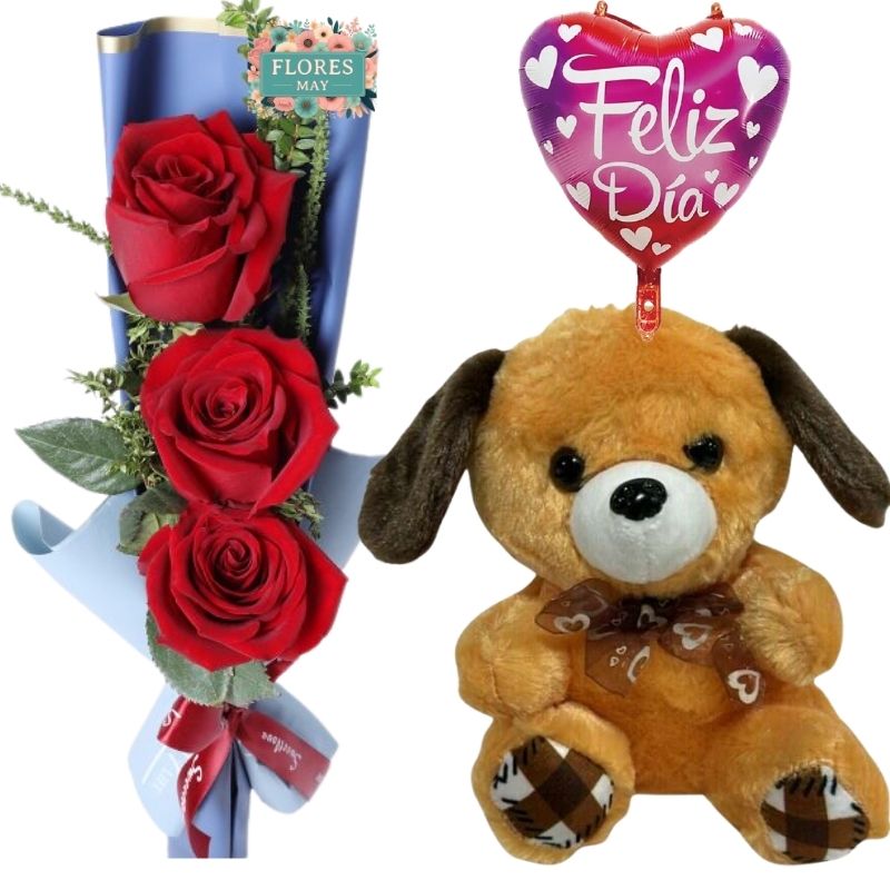 Ramo de 3 Rosas, Peluche Perrito 20cm y Globo