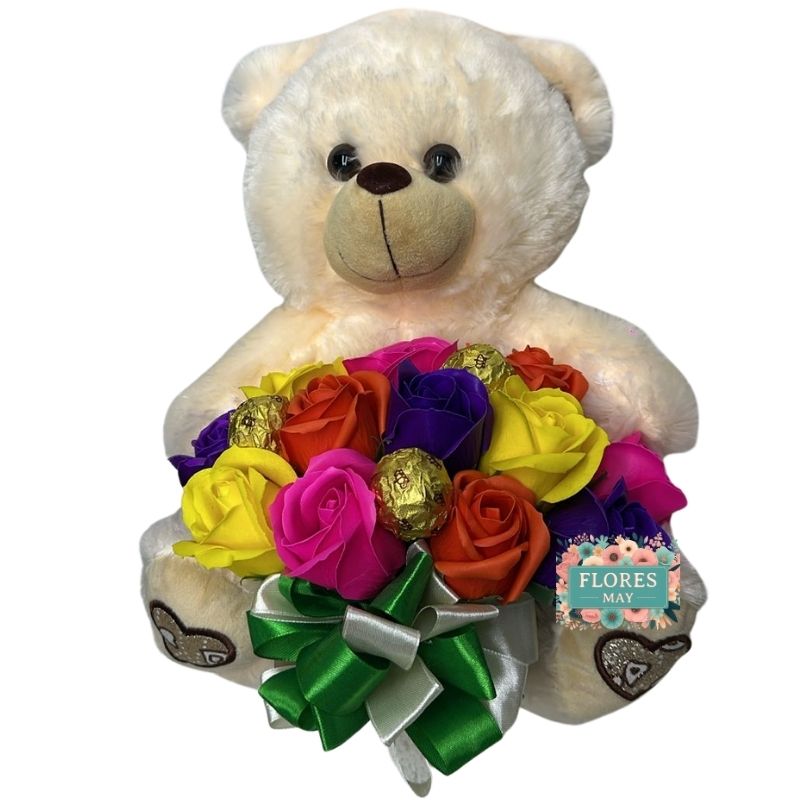 Rosas Eternas Primaverales, Bombones y Peluche Oso 30cm